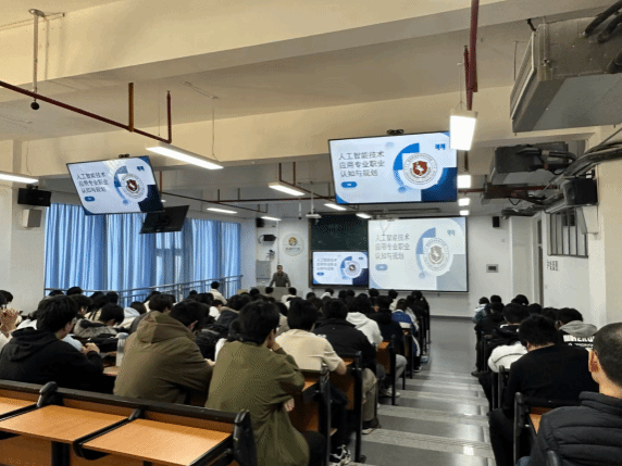 讲座尾声的互动环节中,同学们踊跃提问,就专业学习重点、岗位技能要求、行业发展前景等问题与老师们深入交流。校企教师结合腾讯、华为等头部企业实战案例,从“技术迭代周期”“跨界能力融合”“证书价值权重”等维度给出精准解答,并集体寄语:“在AI重构产业的时代浪潮中,唯有脚踏实地锤炼技术硬实力,方能实现从‘技能工匠’到‘创新工匠’的跃升。”