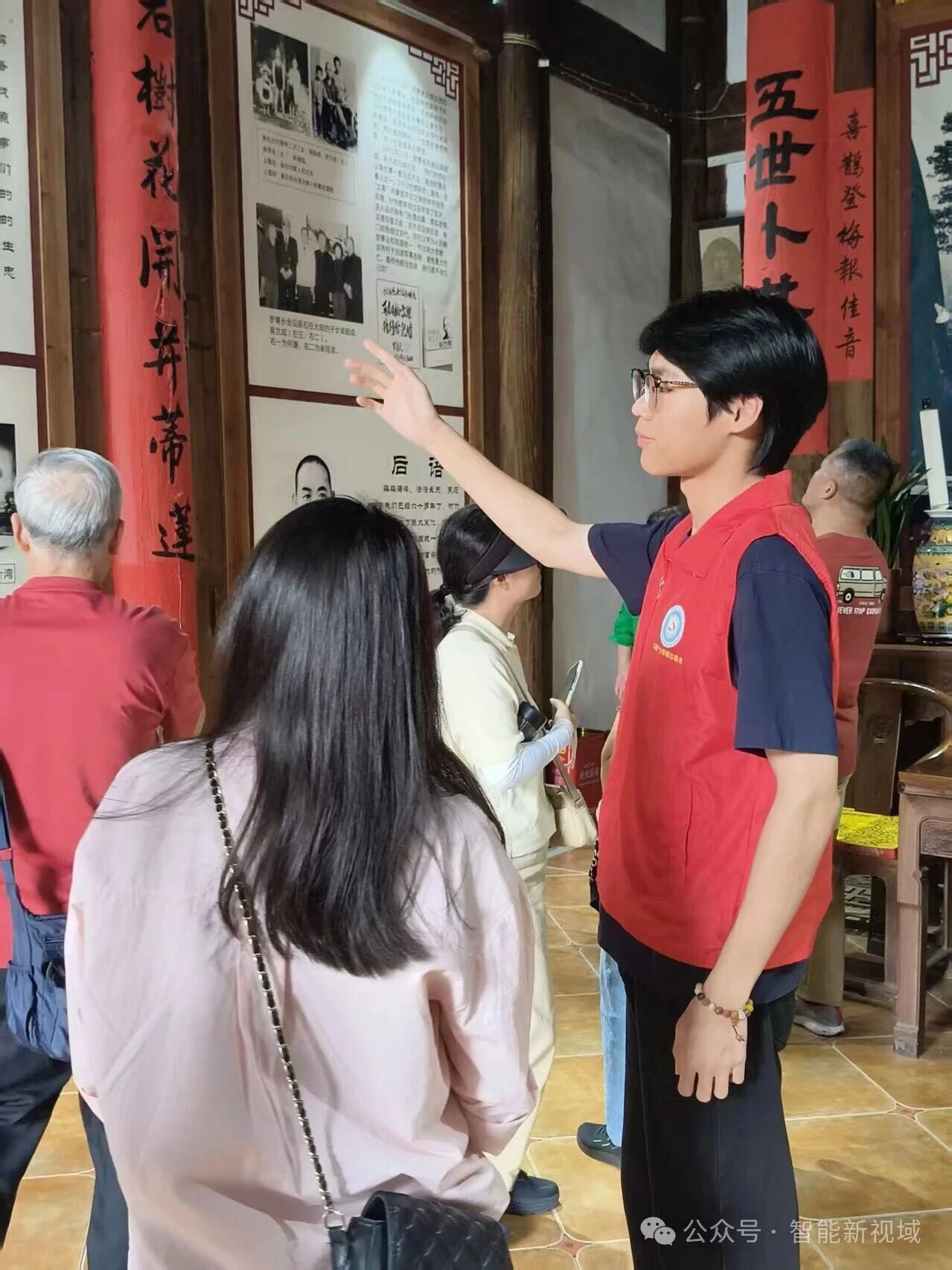 在螺洲天后宫的古雅院落中,身着红色志愿马甲的志愿者正开展讲解服务。他们站在石碑前,为来访游客细致介绍这座文化地标背后的历史脉络与红色印记,将古镇的文化底蕴与精神传承通过规范且生动的讲解传递给每一位听众。在 “福” 字景观前,志愿者与游客亲切交流,用严谨的表述、饱满的热情,让千年古镇的文化故事在新时代焕发出动人光彩,切实以志愿行动助力红色文化与历史文脉的传承弘扬。